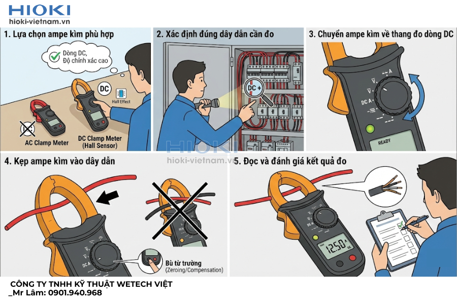 Không phải ampe kìm nào cũng đo được dòng DC. Trước khi đo, cần đảm bảo thiết bị có hỗ trợ đo dòng điện 1 chiều và sử dụng cảm biến Hall. Với các hệ thống yêu cầu độ chính xác cao, bạn có thể chọn ampe kìm như Hioki sẽ có dải đo và độ phân giải phù hợp.