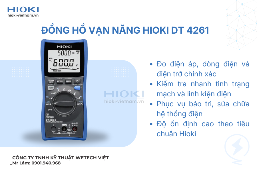 Hioki DT4261 là thiết bị đo điện đa năng cao cấp, hỗ trợ đo điện dung cùng nhiều phép đo nâng cao khác. Thiết bị phù hợp cho môi trường công nghiệp, nơi yêu cầu độ ổn định cao và khả năng đo chính xác trong thời gian dài.