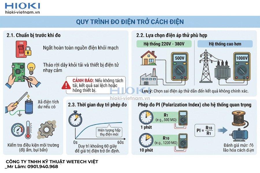 Trong các hệ thống quan trọng, kỹ thuật viên còn thực hiện phép đo PI (Polarization Index) bằng cách so sánh giá trị tại 1 phút và 10 phút để đánh giá mức độ lão hóa cách điện.