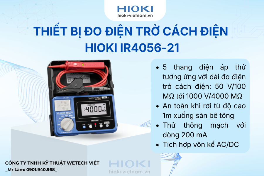 Một trong những model được sử dụng phổ biến trong công nghiệp là Hioki IR4056-21. Thiết bị này hỗ trợ các mức điện áp thử 250V, 500V và 1000V, đáp ứng yêu cầu kiểm tra dây dẫn, động cơ và tủ điện theo tiêu chuẩn IEC.