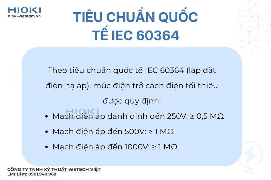 Theo tiêu chuẩn quốc tế IEC 60364 (lắp đặt điện hạ áp), mức điện trở cách điện tối thiểu được quy định như sau: